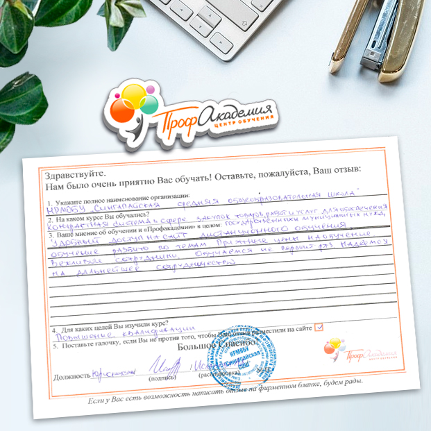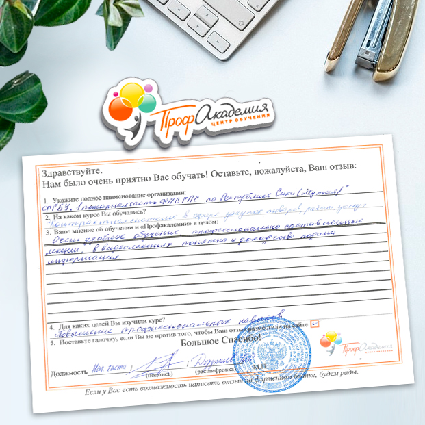Огромное спасибо за отличный учебный материал и за учебный процесс. Обучаемся не в первый раз и остаемся по максимуму довольными всем. "Профакадемия" хорошая, самое главное, что учиться можно в удобное для себя время, не прерывая свою трудовую деятельность. Надеемся на дальнейшее сотрудничество.